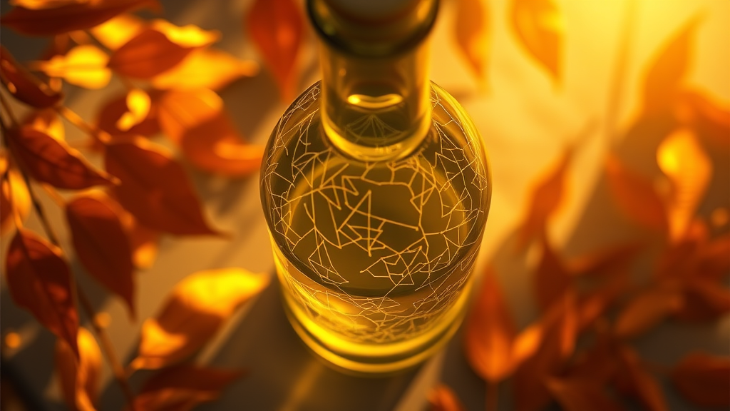 Concept art depicting a top-down view of a mythical olive oil bottle, bathed in the warm glow of golden hour. The glass of the bottle captures and reflects the soft light, creating an intricate pattern of shimmering highlights and shadows. The scene is enveloped in an air of mystery with a subtle diffused glow, casting a natural halo around the bottle, accentuating its unique shape and the fluid's rich, golden-green hue. The background consists of blurred autumn leaves, adding depth and texture to the composition, while maintaining an ethereal and enchanting atmosphere.