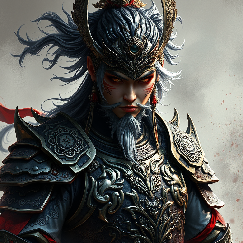 Concept art of a male Asian warrior with intricate oriental body armor and black and silver hair, exuding a psychopathic look. The character is depicted as an ancient war god with award-winning visual style. The artwork is zoomed out featuring a single, solo subject, presented as digital artwork blending illustrative and painterly techniques with matte painting. The piece is highly detailed, photorealistic, and realism-driven, with a distinctively unique and captivating appearance. Avoiding monochrome and red coloring, the design minimizes watermarks and maintains an aesthetically pleasing composition.