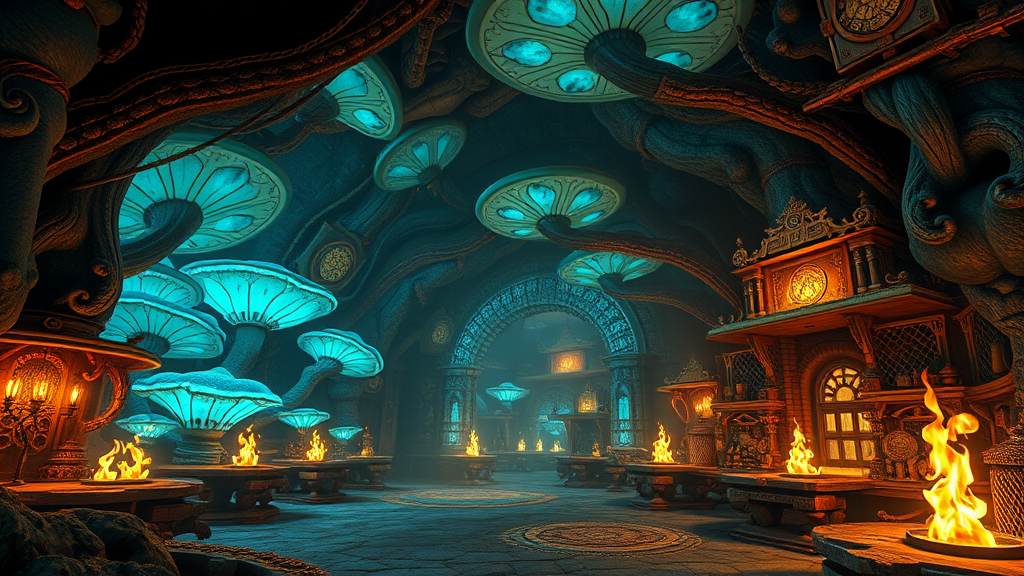 Concept art of a subterranean atelier featuring luminous azure fungi, a bioluminescent canopy, ancient bronze dwarven relics, stunning architectural elements, flickering flames, reminiscent of Skyrim's Blackreach, crafted to be a masterpiece suitable for Artstation, 8k resolution, rapid illustration style, artist's mark, textural depth, photo-realistic rendering, 3D aesthetics, video game ambiance.