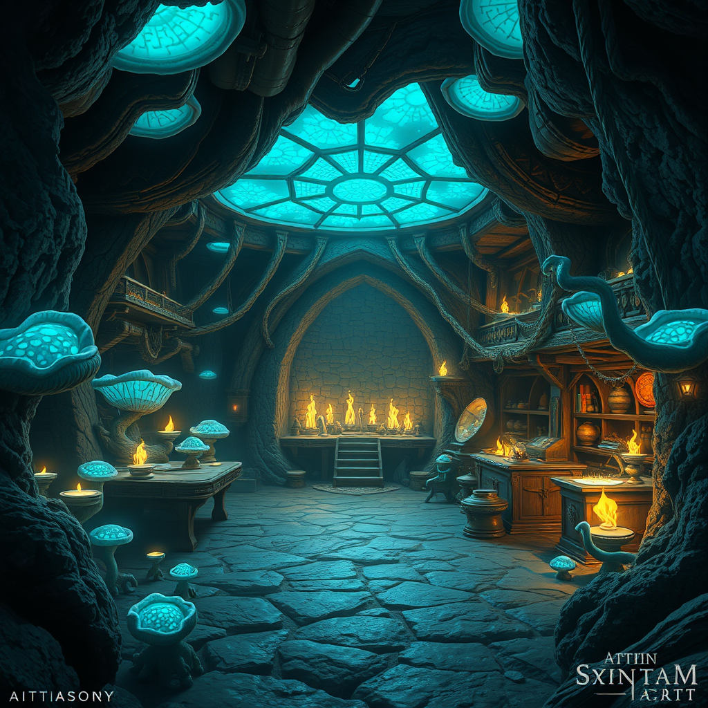 Concept art of a subterranean workshop featuring luminous azure fungi, a bioluminescent roof, ancient bronze dwarven relics, extraordinary architecture, radiant flames, reminiscent of Skyrim's Blackreach, a masterpiece suitable for ArtStation, 8k quality, speed painted, with an artist's signature, including elements of text, photography, rendering, 3d graphics, and evocative of a video game setting.