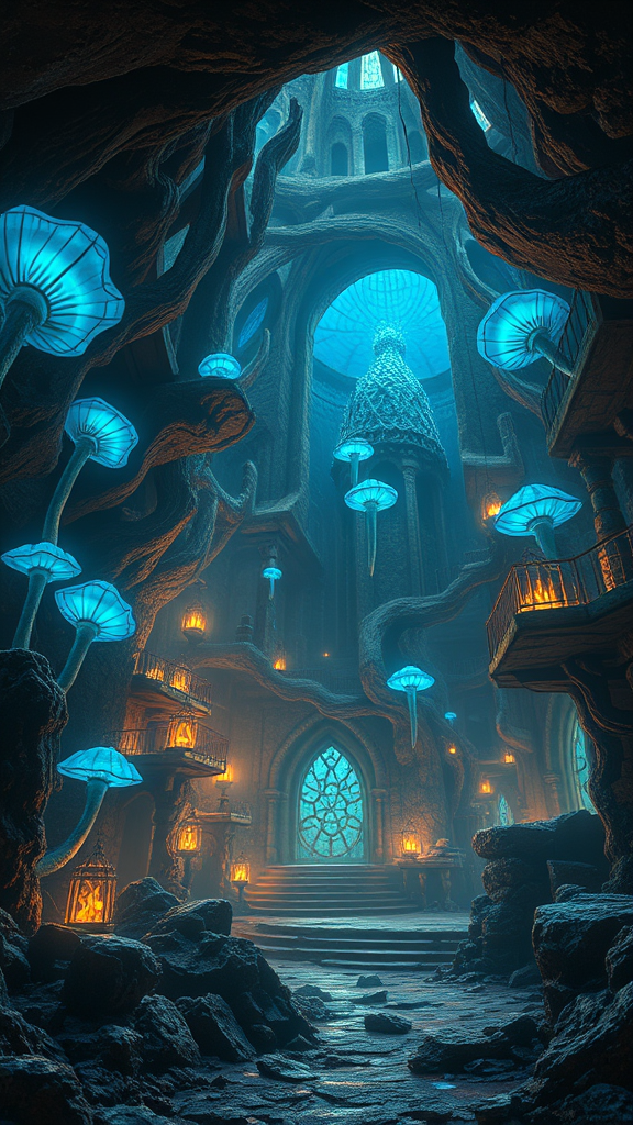 Concept art of a subterranean workshop with radiant azure fungi and a luminescent ceiling, ancient bronze dwarven ruins showcasing extraordinary architecture, flickering flames casting warm glows, reminiscent of Blackreach from Skyrim, rendered as a masterpiece featured on ArtStation, high resolution 8k speed painting intertwined with an artist's signature, elements blended with text, photographic detail, 3D rendering, evocative of an immersive video game world.