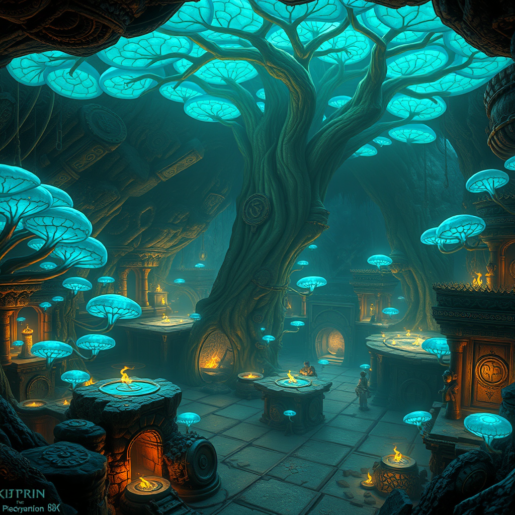Concept art of an expansive subterranean workshop illuminated by glowing azure fungi and a bioluminescent canopy, surrounded by ancient bronze structures reminiscent of dwarven craftsmanship. The architecture is mind-blowing, with intricate designs and mysterious runes. Flickering embers from hidden fires cast warm shadows across the space, reminiscent of Skyrim's Blackreach. The scene is a masterpiece, worthy of a feature on ArtStation, brought to life in stunning 8k. The creation process is akin to a speed painting, yet every detail is meticulously rendered. This digital artwork appears as if it belongs in a high-caliber video game, complete with an artist's signature subtly integrated into the scene.