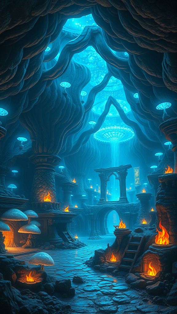 "concept art of an expansive underground workshop, adorned with glowing blue mushrooms casting an ethereal light, a bioluminescent ceiling shimmering like a starlit night, ancient bronze dwarven ruins scattered among incredible architecture, flickering with vibrant flames in contrasting hues. Evoking the mystical allure of Skyrim's Blackreach, this masterpiece is envisioned as a speed painting rendered in stunning 8k detail. The artwork, worthy of being featured on ArtStation, showcases a realm that blends fantasy with intricate craftsmanship, capturing the imagination with each brushstroke as an artist's signature adds a personal touch. Visualized as a scene from a high-fidelity video game, offering a breathtaking glimpse into a vividly imagined world."