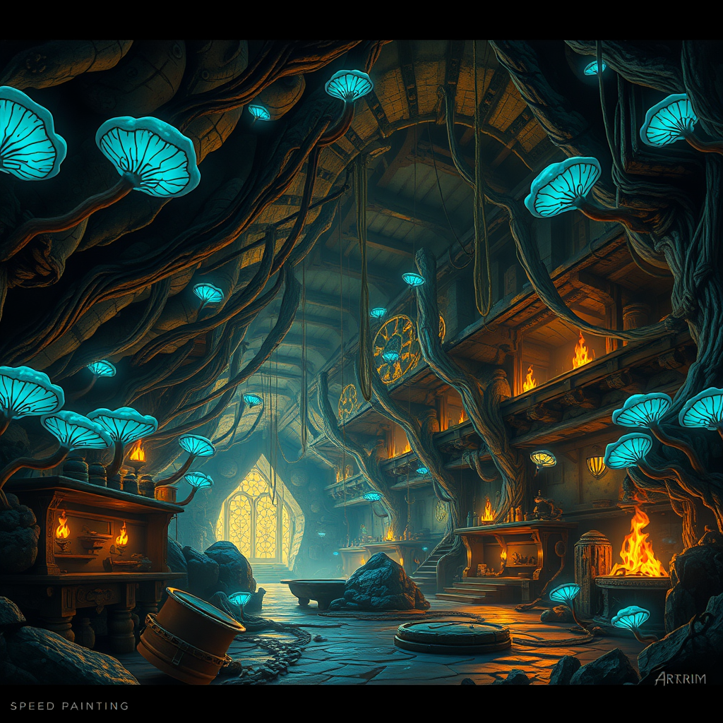 Concept art of an underground workshop featuring luminescent azure fungi, a ceiling aglow with bioluminescent tendrils, ancient bronze dwarven remains, and breathtaking architecture illuminated by fiery embers, reminiscent of Skyrim's Blackreach, presented as a masterpiece on ArtStation, 8k resolution, speed painting style, artist's signature incorporated, captured in a single frame, seamlessly blending elements of photography, 3D render, and video game aesthetics.