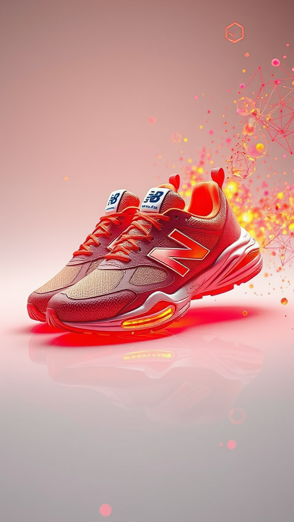 Concept design of futuristic New Balance shoes featuring advanced nanotechnology, showcasing a warm and bright color palette in an open composition. Photographed in a style reminiscent of Thomas Kuoh's work, the design incorporates elements of chaos and precision, resulting in a visually striking piece. The shoes highlight innovation and forward-thinking aesthetics, capturing the essence of the future in footwear.
