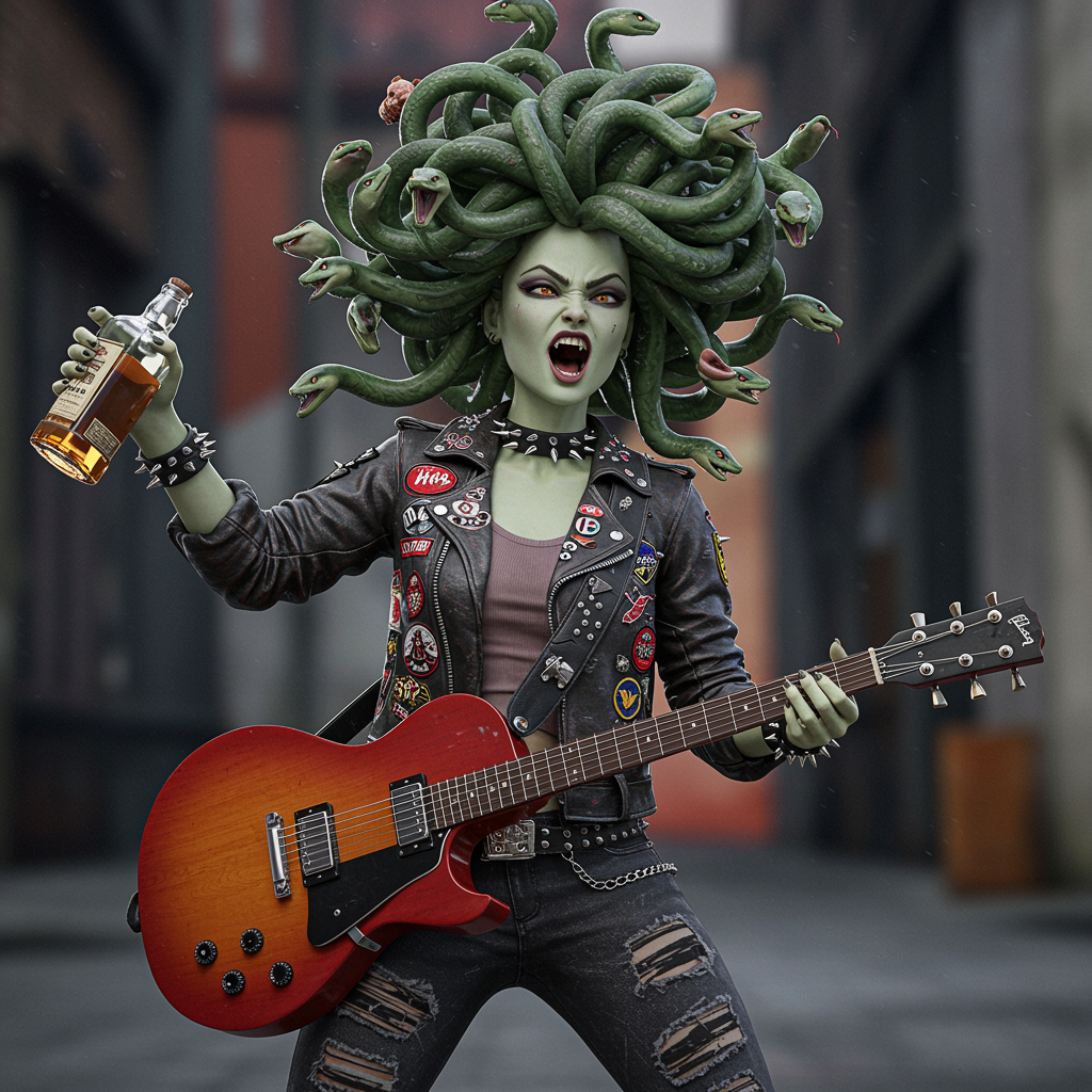 Conceptual 3D render image of a rebellious punk Medusa, the legendary Gorgon of Greek mythology, with her snakes in a chaotic hairstyle. She strikes an informal, daring pose, wearing a weathered leather jacket adorned with punk patches, energetically playing an electric guitar. In her other hand, she holds a whiskey bottle, ready to take a swig. The scene is rendered in high-resolution photorealism with a gritty urban backdrop, capturing the raw energy and charisma of this mythological rock star. The rendering style brings out intricate details, such as the texture of her jacket and the gleaming scales of her snake hair, evoking a sense of audacious rebellion while trending on art-focused platforms.
