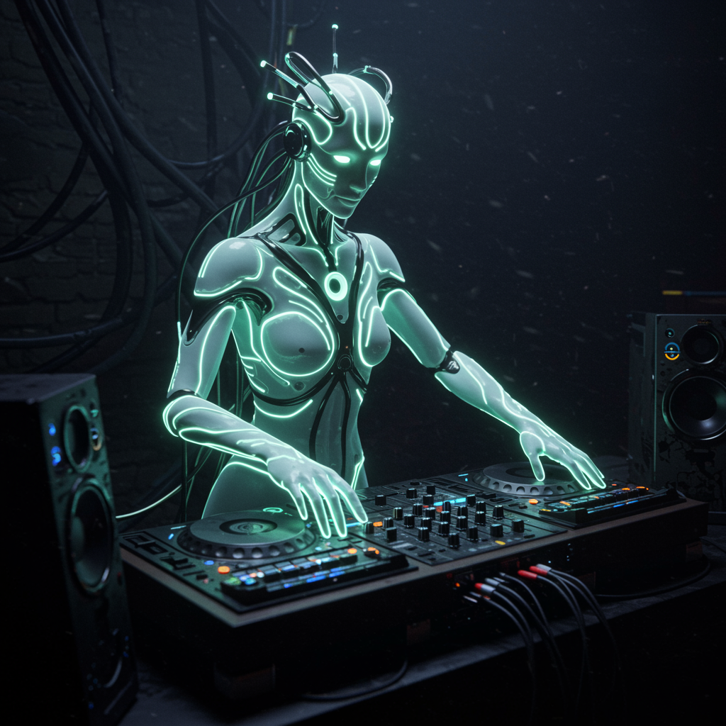 Conceptual 3D render of a bioluminescent figure with artificial intelligence, expertly blending into an otherworldly DJ console. The scene is super highly detailed, combining professional digital painting techniques and extreme illustration. Imagery inspired by ArtStation aesthetics, featuring a smooth, sharp focus that elevates the visual impact. Crafted using Unreal Engine 5 and Cinema 4D, the render achieves photorealism in stunning HD quality at 8k resolution. A fusion of cinematic beauty and detailed artistry reminiscent of works by Artgerm, Greg Rutkowski, and Alphonse Mucha.