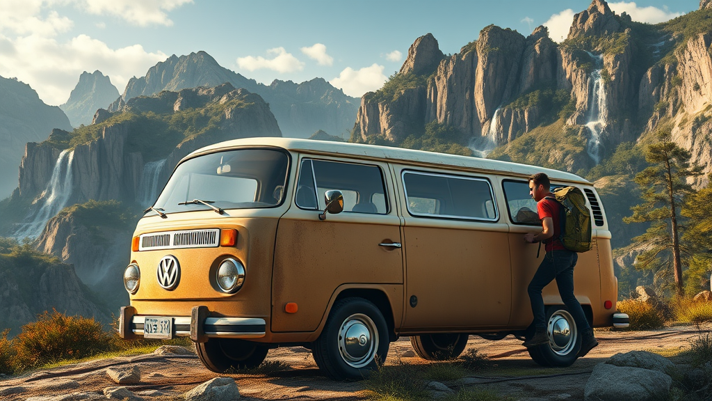Conceptual icon art featuring a vintage Kombi Volkswagen van rendered in extremely detailed 8K resolution, embracing realistic textures and faithfully replicating the rough cladding and worn chrome accents of the vehicle. In the background, an immersive 360-degree high-detail landscape landscape of the Japanese mountains spans, evoked by expertly modelled rock formations, overgrown trees, and lacy waterfalls. Advanced lighting and shadow techniques have been applied to create an otherworldly atmosphere, imbuing the scene with an enchanting mystique. To complete the scene, various animated elements are incorporated, depicting someone in hiking gear smoothly navigating the terrain with their pack on.