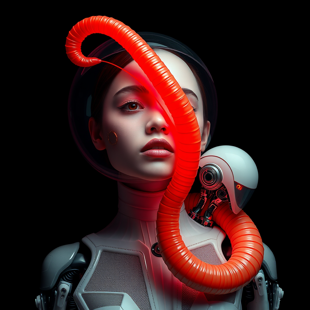Conceptual portraiture inspired by a futuristic aesthetic, featuring a rubber sphere and a worm intertwined with a glowing red light, embodying technology-based art. The scene includes futuristic robots with elements reminiscent of Elina Karimova's style, set against a light black background. Oversized objects stand out in this high-concept portrayal, maintaining a raw and imaginative visual narrative.
