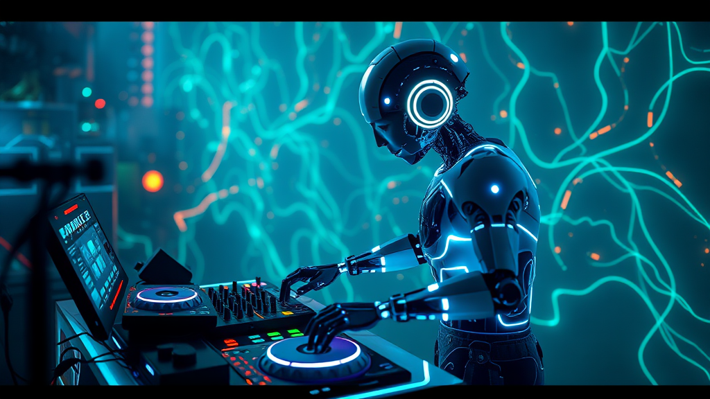 Conceptual render of an AI-driven bioluminescent figure at a DJ console, intricately detailed with professional digital painting techniques; inspired by artstation and contemporary concept art. The scene showcases smooth, sharp focus and vivid colors, capturing the essence of extreme illustration. Rendered in Unreal Engine 5 for photorealistic quality, the composition is in HD with stunning 8k resolution. Utilizing cinema 4d for advanced 3D effects, the image radiates beauty and cinematic flair. Influences by artistic masters like Artgerm, Greg Rutkowski, and Alphonse Mucha infuse the piece with a flowing, ethereal aesthetic, transcending traditional perspectives.