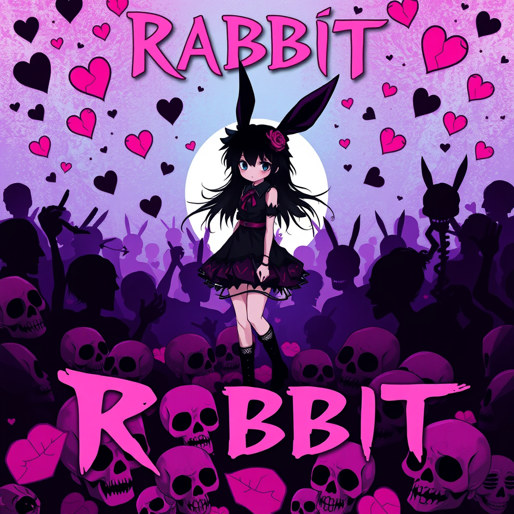 Concert artwork depicting a poster for the band "Rabbit", featuring a single girl amidst a theme of broken hearts and skulls. The color palette focuses on vivid shades of purples, pinks, and blacks. The art style showcases black silhouettes set against an Ultra High Definition and High Dynamic Range (UHD, HDR) quality in 8K resolution. The character, inspired by a "Dark Sushi Mix," is creatively illustrated, emphasizing a mystical and edgy aesthetic, maintaining a unique yet striking appearance. The design avoids any undesirable traits such as duplication, disfigurement, or any form of mutation. The poster should be clean and clear, free of low-resolution issues, visual artifacts, and unnecessary text or logos.