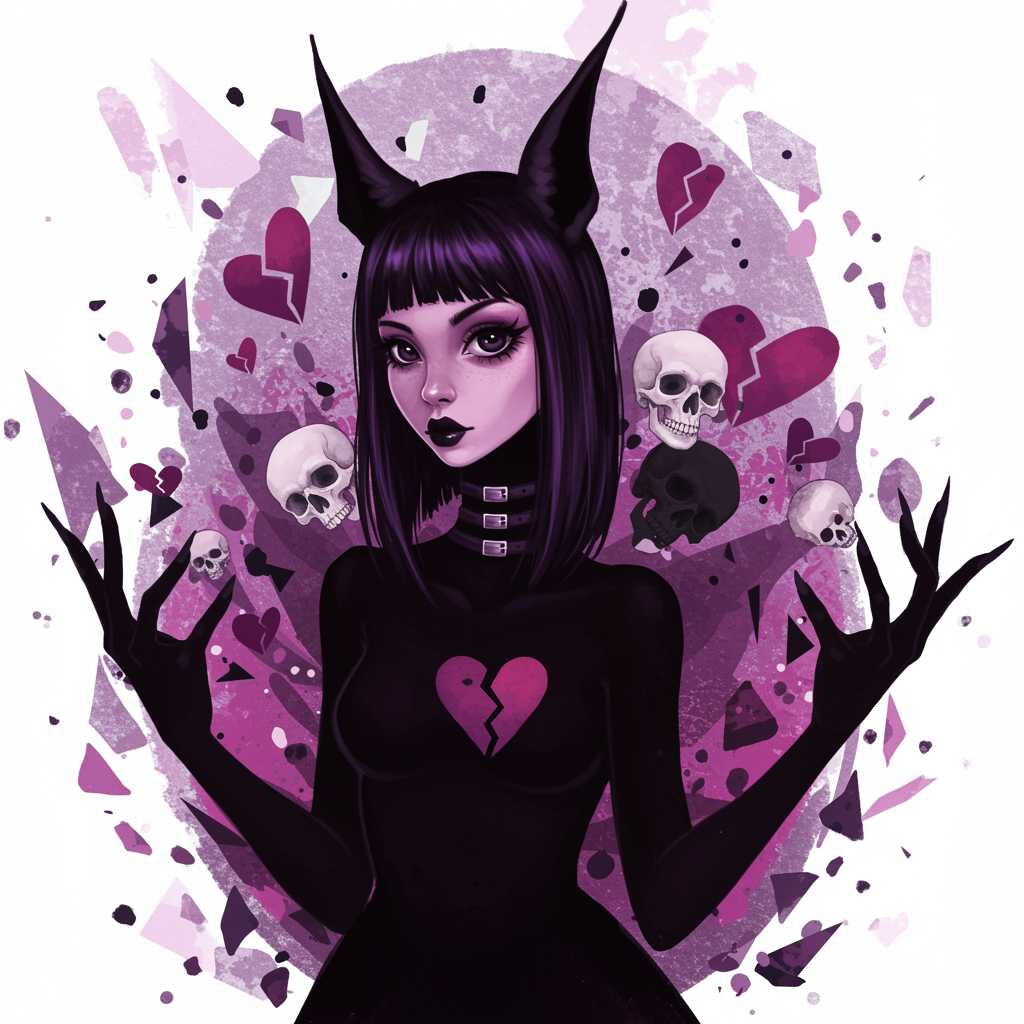 View this AI-generated image featuring concert poster for the band rabbit features 1 girl with broken hearts and skulls showcasing a color theme of purples pink and black displays black silhouette art and is crafted in uhd hdr 8k quality the central figure is inspired by the model dark sushi mix the