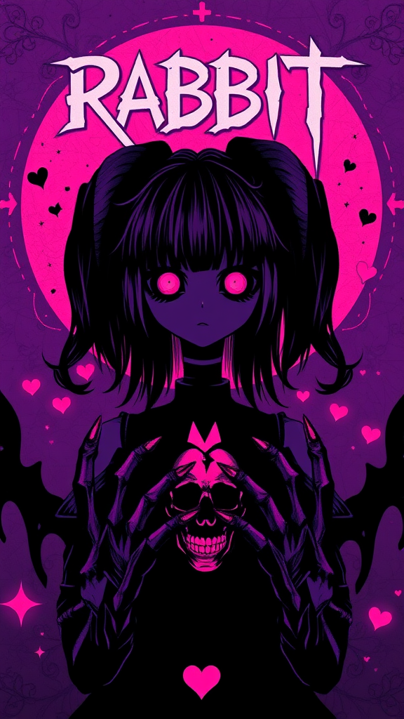 Concert poster for the band featuring Rabbit, a girl with an emphasis on broken hearts and skulls, using a theme of purples, pinks, and black. Art style in black silhouette with UHD, HDR, and 8K quality. Model inspiration: Dark Sushi Mix. Focus on a unique character with distinct features such as a long neck and expressive eyes. Hands may appear creatively altered with additional fingers. Avoid low-resolution images, ensure the subject is fully within the frame, and maintain high clarity without artifacts or distractions like watermarks, logos, or text. Embrace a mysterious, abstract style with a cohesive composition.