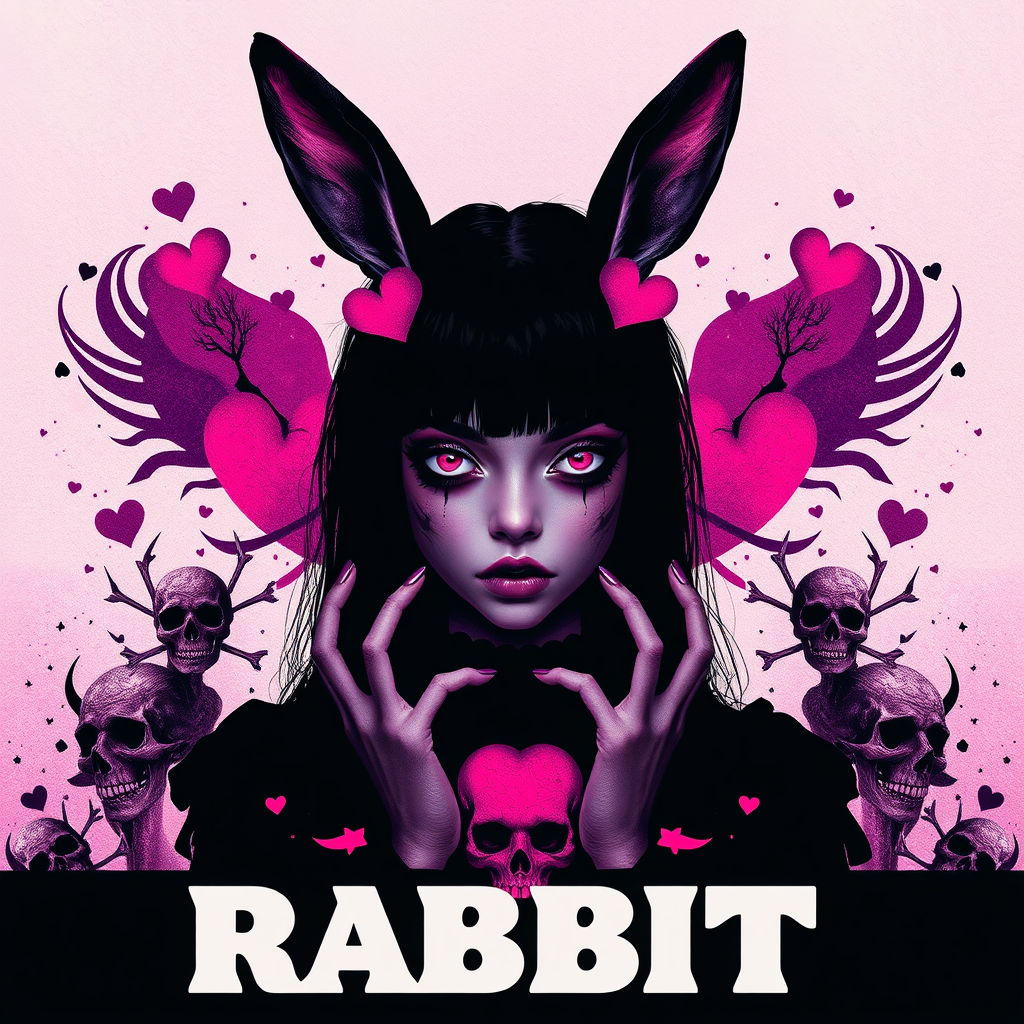 Concert poster for the band Rabbit, featuring 1 girl with a theme of broken hearts and skulls in purples, pink, and black; black silhouette art in UHD, HDR, 8K quality. The design centers around a model with a dark, mysterious aura. Elements such as artistic mutations and distortions create an edgy, surreal visual. The girl's eyes are bold yet uniquely imperfect, with features like asymmetrical eyes and distinct hands adding character. The background is a seamless blend of high-resolution graphics, free from artifacts or distracting elements. The poster has an abstract, mysterious feel with no text or logos to detract from its artistic focus.