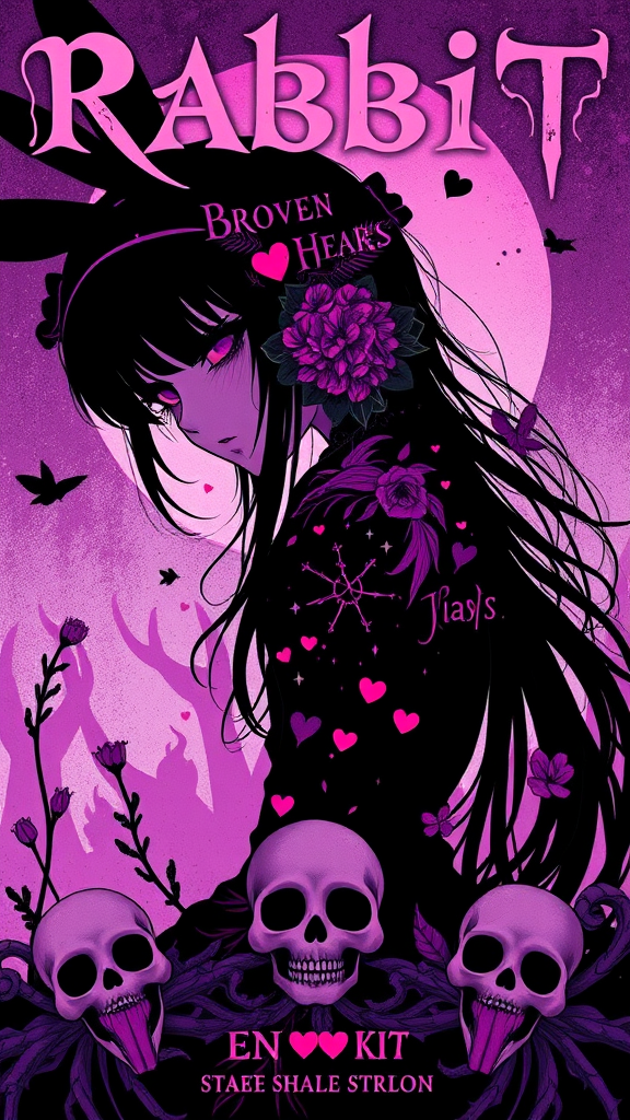 Concert Poster for the band Rabbit featuring a central girl with themes of broken hearts and skulls in a palette dominated by purple, pink, and black. The design showcases a striking black silhouette art style with UHD, HDR, and 8K quality. Model inspiration drawn from Dark Sushi Mix Mix illustrates a unique blend, imbuing the visual with a mystical edge. The composition is neither cluttered nor visually incomplete, maintaining clarity and avoiding low resolution effects. The overall aesthetic is polished without unwanted artifacts or text disturbances, creating a seamless and compelling poster that draws the viewer into its atmospheric and mysterious world.