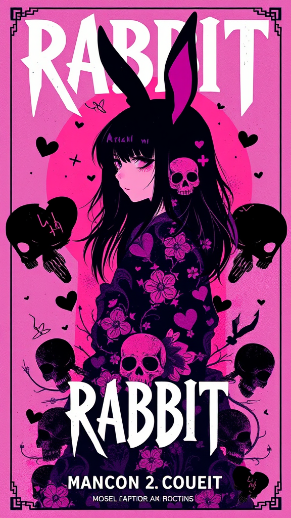 Concert Poster for the band Rabbit, featuring a single girl with themes of broken hearts and skulls. The color scheme is purple, pink, and black, with black silhouette art. The design is in UHD, HDR, 8K resolution. The model Dark Sushi Mix is incorporated in an abstract fashion. Avoid any elements like disfigurement, distortion, or cloning, instead focusing on creative and edgy aesthetics. Ensure the artwork is clear, in-frame, and free from artifacts or text. The poster should convey an atmospheric and surreal vibe, with a smooth, visually striking and cohesive appearance.