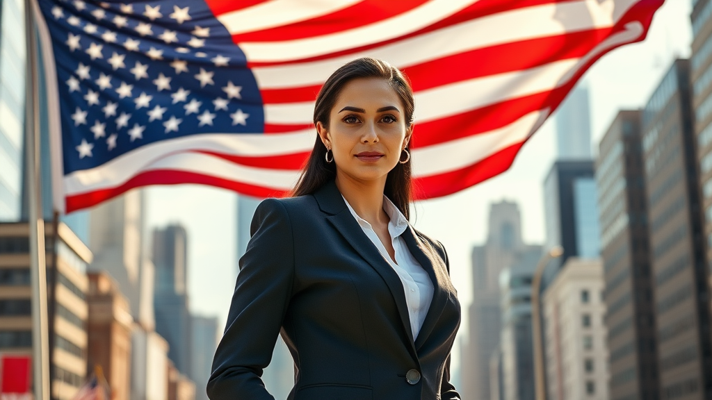 Confident businesswoman standing proudly before a waving American flag, exuding professionalism and strength, adult, elegant attire, realistic style, bustling city backdrop, midday sunlight accentuating determination, poised expression, diverse background, contemporary business setting, harmonious color palette, inspiring and empowering atmosphere.
