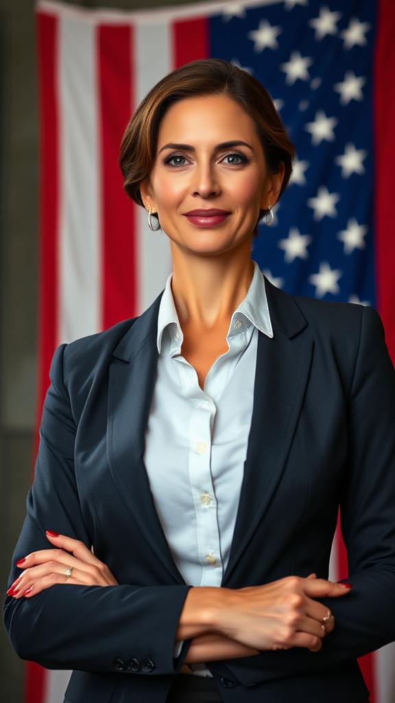 Confident businesswoman standing proudly before an American flag, professional attire, poised demeanor, mature, elegant, realistic portrayal, emphasizing leadership and success, strong national identity, vibrant colors, attention to detail, inspiring atmosphere.
