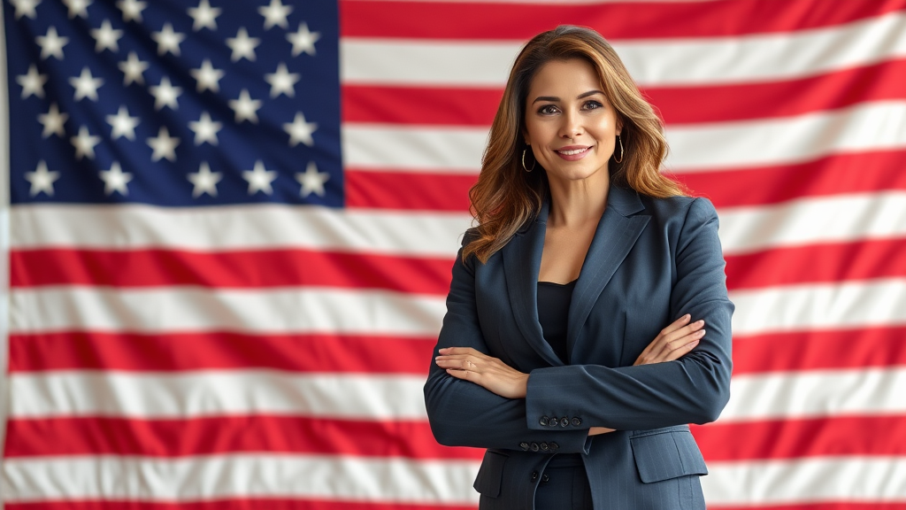 Confident businesswoman standing proudly in front of the American flag, professional attire, poised stance, expression of determination, mature, realistic style, vibrant colors, representing success and leadership in a dynamic corporate environment.