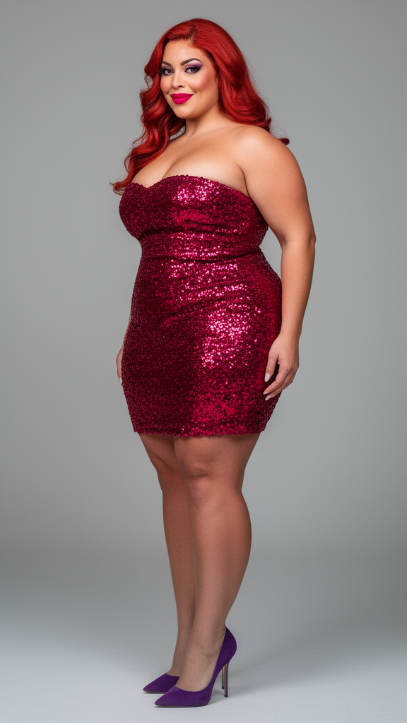 A full-body portrait of a confident woman with vibrant red hair, wearing a shimmering red sequin dress and purple heels. Her charming smile and elegant pose exude natural sensuality and grace.