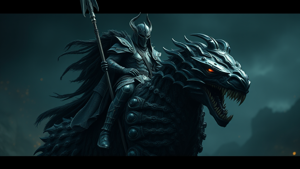 Conquest, clad in full battle gear, mounted on a fearsome beast, enveloped in an atmosphere of horror and darkness, featuring intricate designs and fine details; captured with photography lighting in a photorealistic style, evoking a cinematic quality with subtle cinematic noise. Rendered using octane for a focused, hyperrealistic effect, enhanced through VFX post-production with RTX ray tracing lighting, suitable for galleries like ArtStation and CGSociety, presented in a 9:16 aspect ratio.