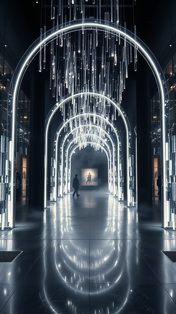 Contemporary art gallery entrance with luminous cascading light sculptures, featuring a sleek minimalist arched light installation creating an immersive tunnel effect, capturing a cinematic atmosphere with perfect symmetry and ultra sharp details. Shot with a medium format camera, enhanced by dramatic side lighting and a reflective obsidian granite floor, the scene exudes an ethereal aura with misty elements. Geometric glass grid patterns contribute to the twilight ambiance, achieving photorealism with rich detailing.