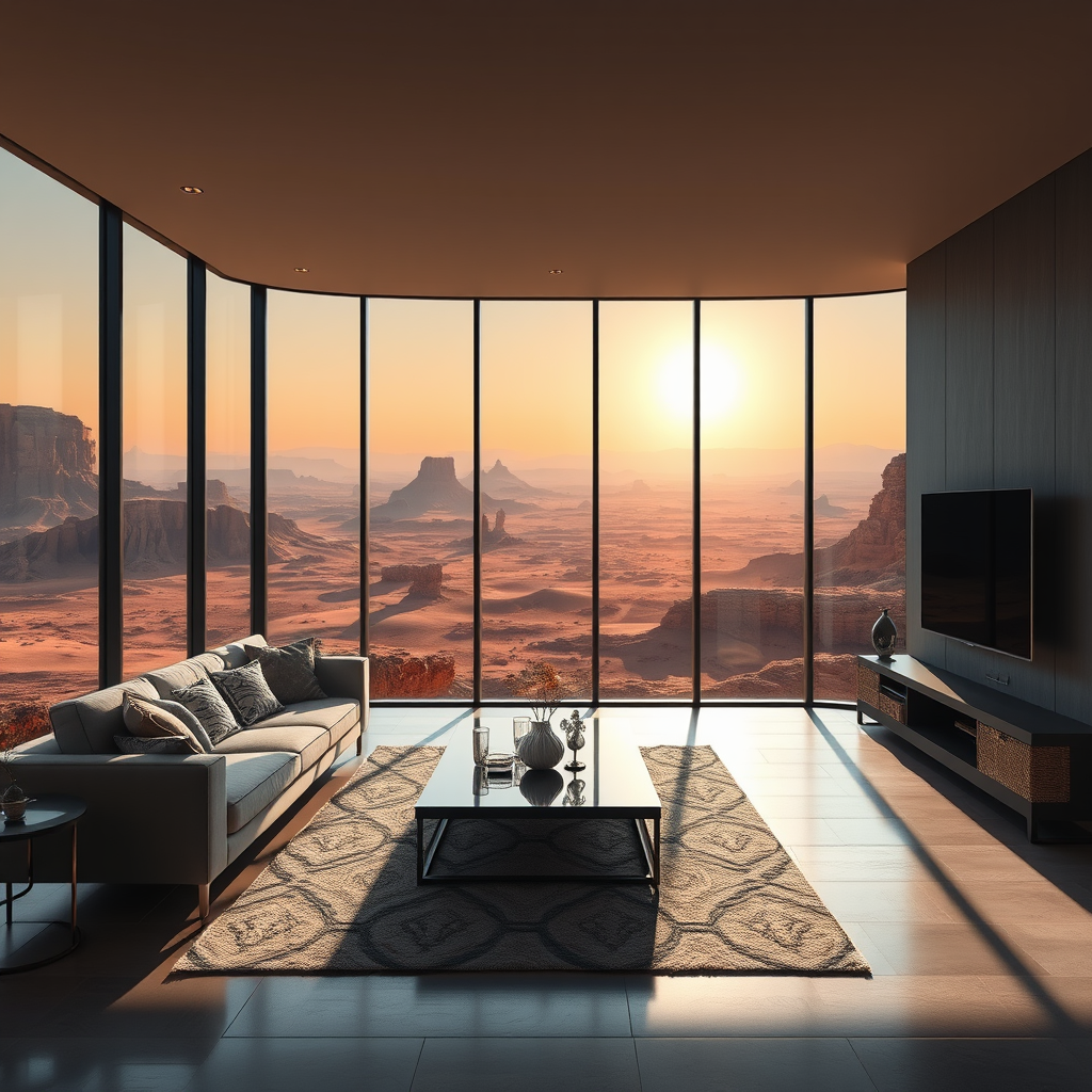 Contemporary living room featuring expansive windows overlooking the captivating martian landscape, infused with a sense of fantasy, digital art, photorealistic, exceptional quality, high resolution, with intricate detailing, a potential portfolio masterpiece, echoing the style of Bryan Organ with matte finishes, gaining popularity on ArtStation, reminiscent of Greg Rutkowski's work, imagined by a talented artist -neg, excluding provocative content.