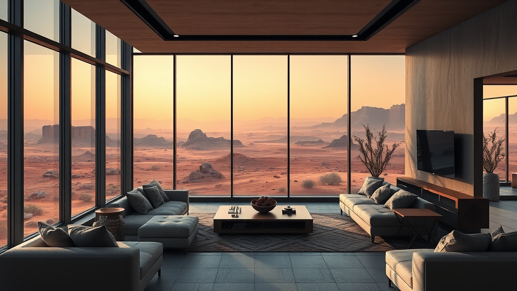 Contemporary living room featuring large windows revealing a stunning view of the Martian landscape, fantasy digital art, exquisite quality, high resolution, showcasing intricate details as a potential portfolio piece, evoking the style of Bryan Organ with matte textures, trending on ArtStation, influenced by Greg Rutkowski.