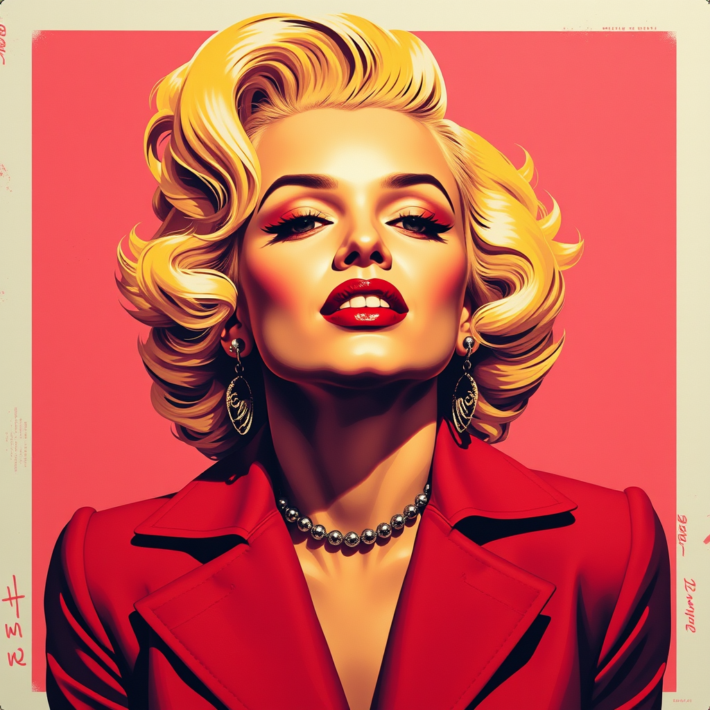 Contemporary portrait of Marilyn Monroe, wearing chic and stylish attire, exuding glamor and sophistication, artistic flair, vibrant poster aesthetic, captivating and dynamic composition, warm and vivid color palette, elegant and modern interpretation.