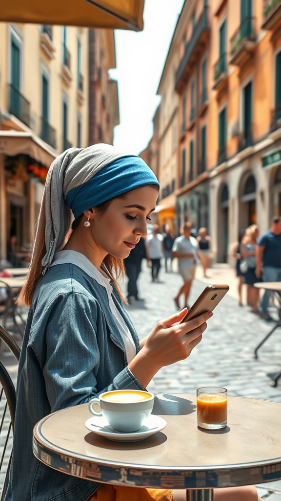 Contemporary recreation of "Girl with a Pearl Earring," digital photograph set in an Italian piazza, young woman at an outdoor cafe scrolling through her smartphone, cappuccino on the table, vibrant and relaxed ambiance, subtle nod to classic art with a modern twist, sun-dappled cobblestones and the hum of daily life in the background, with "art-meets-modernity" vibe
