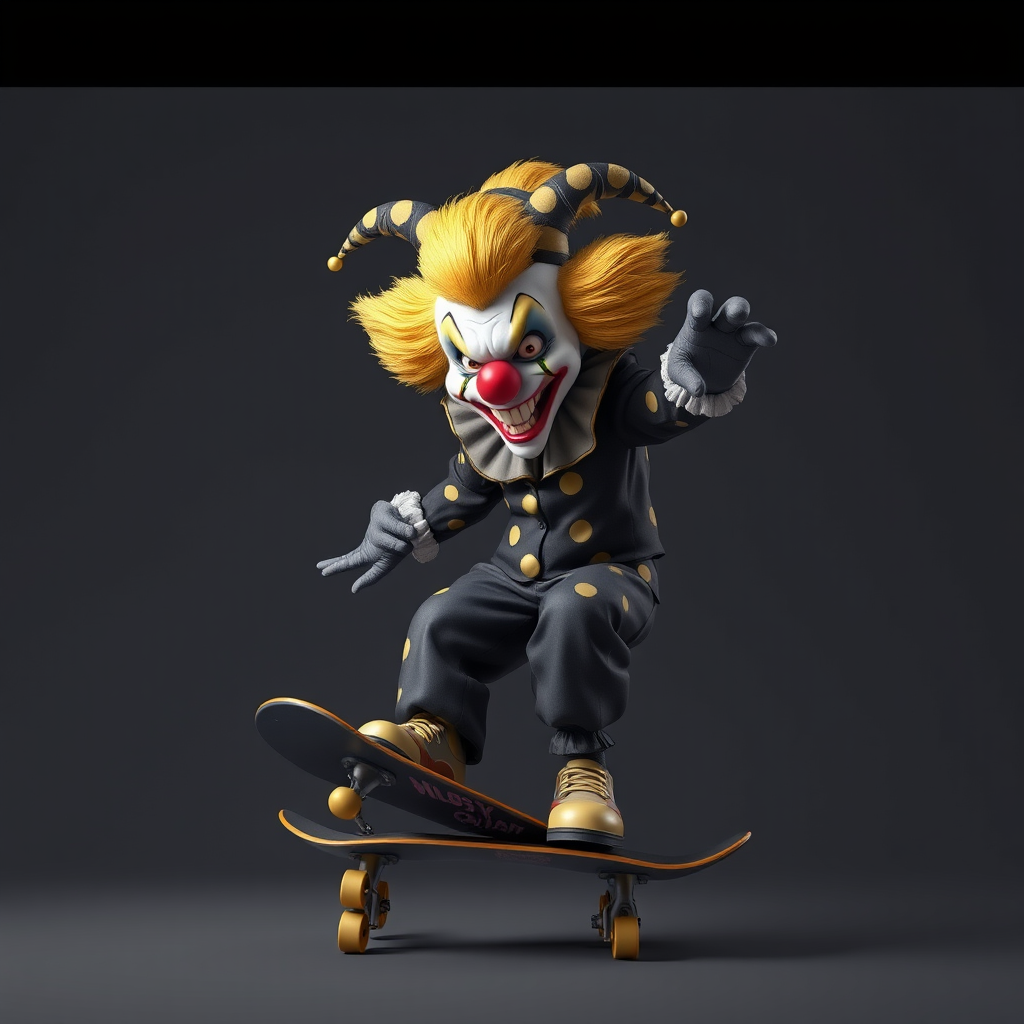 Contemporary skateboarding clown, digital art, 3D visualization, rich dark and golden color scheme, high-contrast elements, playful yet sophisticated design.