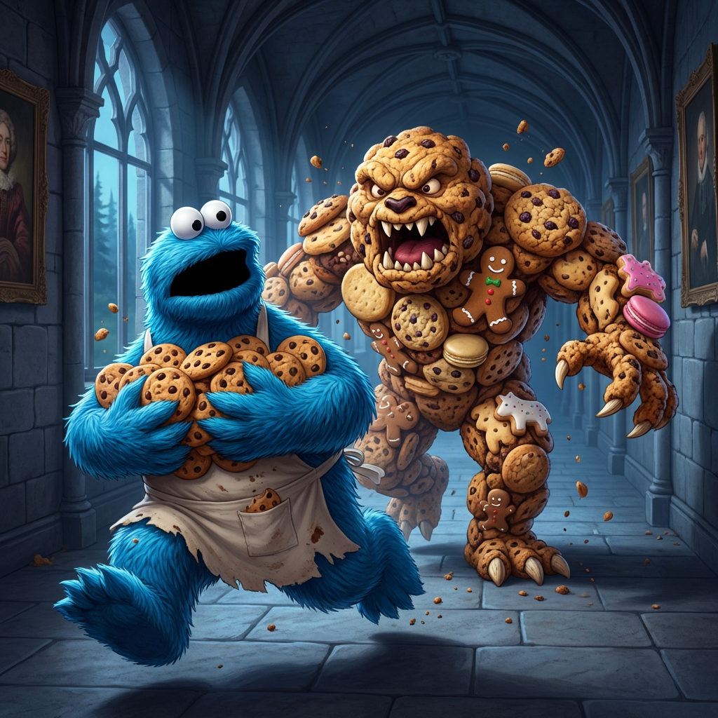 The iconic Cookie Monster, clutching a pile of chocolate chip cookies, frantically runs through a grand corridor. He is pursued by a monstrous creature made entirely of various cookies, creating a whimsical yet intense chase scene.