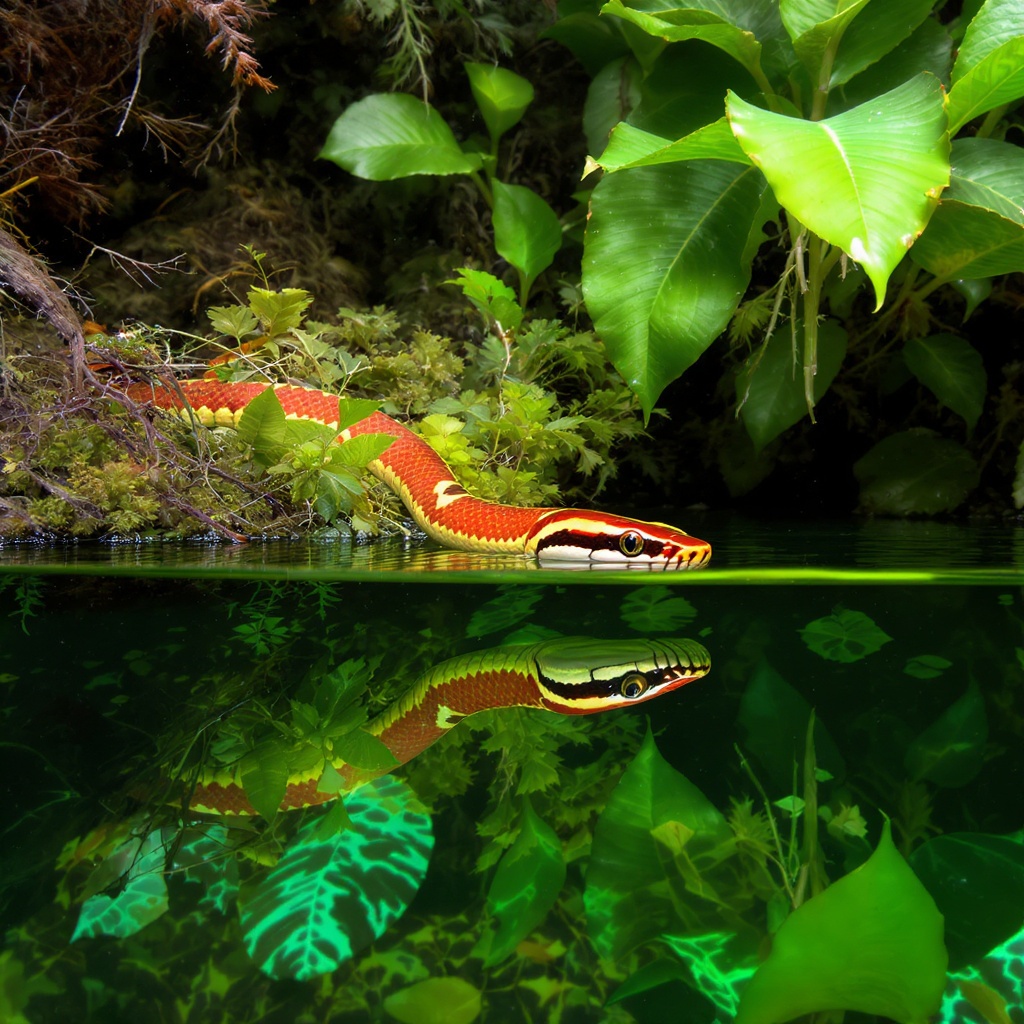 View this AI-generated image featuring a vibrant coral snake emerges from a lush backdrop of tropical plants its striking colors vivid against the deep green foliage half of the snake s head is submerged in crystal clear water creating a mesmerizing and realistic reflection that mirrors its intricat