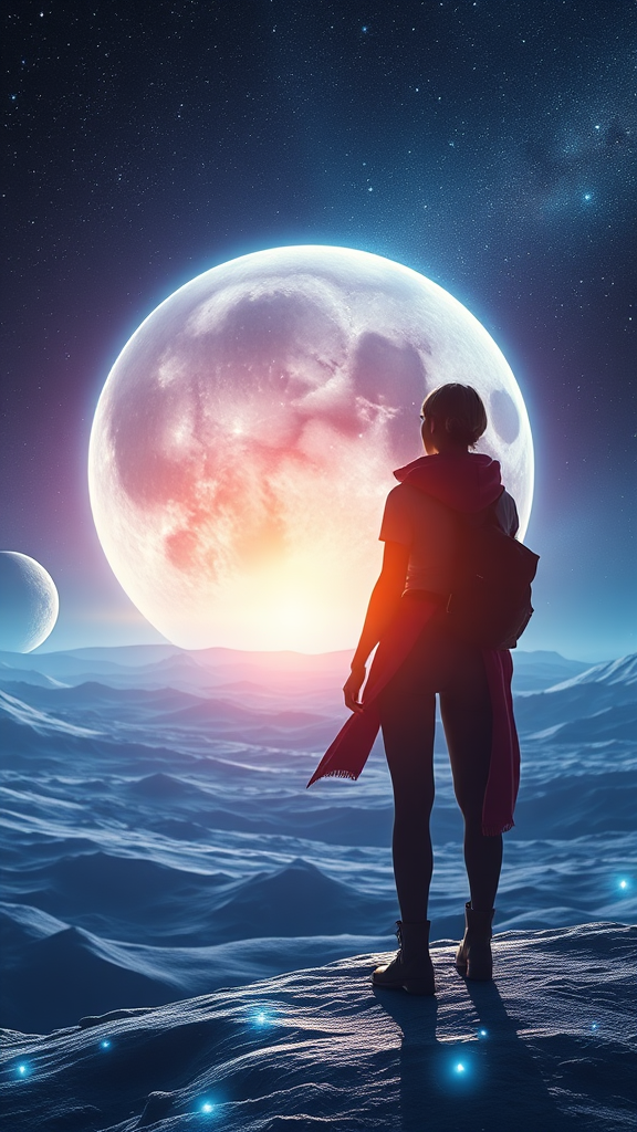cosmic adventurer, back turned, graceful silhouette, standing on a luminescent lunar landscape, gazing into the infinite horizon