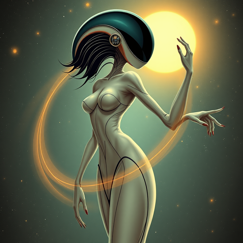 Cosmic alien woman character, graceful minimalistic creature exuding elegance, allure, and charm, full body depiction, captivating and feminine, embodying love and beauty, striking an epic pose of sophistication, whimsical yet stylish, reminiscent of Daft Punk's futuristic aesthetics, art style inspired by Roger Fry’s portraiture finesse and Gaston Le Touche’s delicate touch.