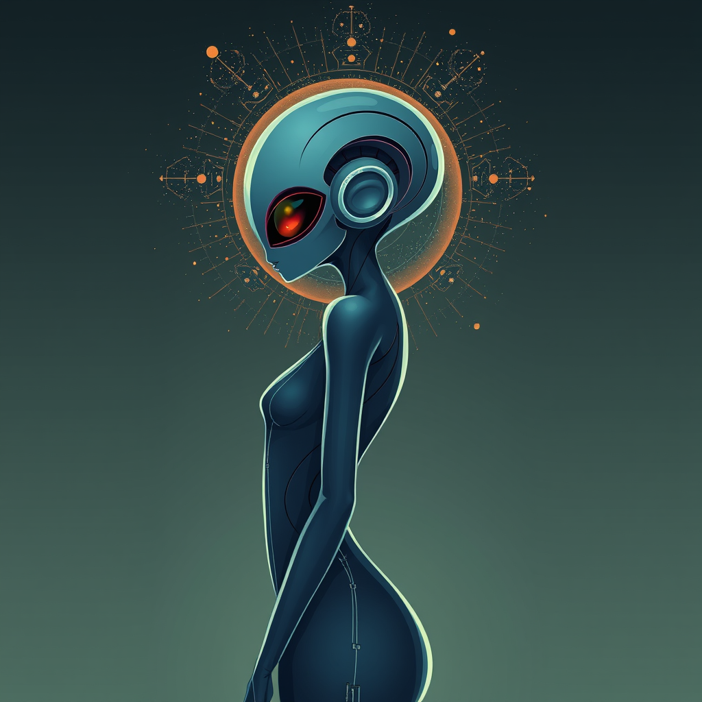 Cosmic alien woman character, sleek minimalist celestial female figure, captivating allure, graceful and enchanting, radiating femininity, essence of love and beauty, charming and passionate, poised in an elegant stance, exuding a Daft Punk futuristic vibe, art style inspired by the elegance of Roger Fry and the delicate touch of Gaston Le Touche.