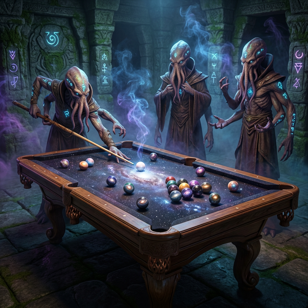 A photorealistic American pool table in a mysterious dimly lit chamber with ornate carved stone walls and mystical atmosphere. The pool table is regulation size with shimmering galactic dust set against the dark void of space colored felt and ornate wooden legs with intricate carvings. All 15 pool balls are designed as detailed miniature galaxies - including swirling spiral galaxies with bright blue arms and yellow cores, elliptical galaxies with warm golden tones, barred spiral galaxies with distinct central bar structure, irregular galaxies with scattered star clusters in purple and pink hues, and the 8-ball as a dark cosmic void with distant stars, there are no numbers on any of the balls as they are all distinct galaxies. The white cue ball appears as a bright nebula. Around the table stand 3-4 strange alien gods - towering eldritch beings with multiple eyes, tentacle-like appendages, glowing runes on their skin, wearing flowing cosmic robes that shimmer with starlight. One alien god is leaning over the table taking a shot with an ornate pool cue, others are watching intently, one of the watching beings as multiple arms. Intricate details throughout - carved symbols on the walls, mystical smoke in the air, dramatic lighting casting long shadows, shallow depth of field, highly detailed, 8k quality, professional photography, surreal fantasy atmosphere
