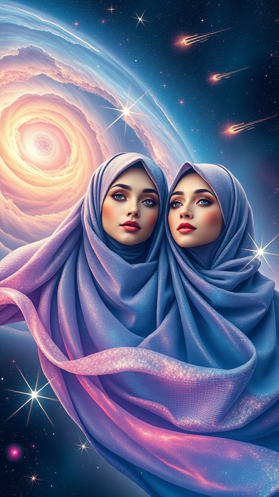 Cosmic hijabi queens adorned in iridescent diamonds, shimmering with stardust, drift serenely amidst a tapestry of nebulae, their hijabs flapping like celestial sails in the currents of space, surrounded by swirling galaxies and shooting stars, their faces radiant with a soft, ethereal glow, while their ellepaths waft like aurora borealis ribbons.