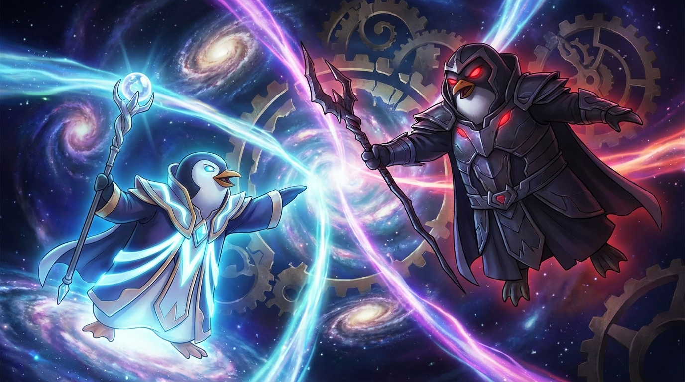 Two powerful penguin sorcerers, one good and one evil, engage in a magical battle amidst swirling galaxies and cosmic energies. The vibrant digital illustration captures a dynamic fantasy scene with glowing staffs and dramatic lighting.