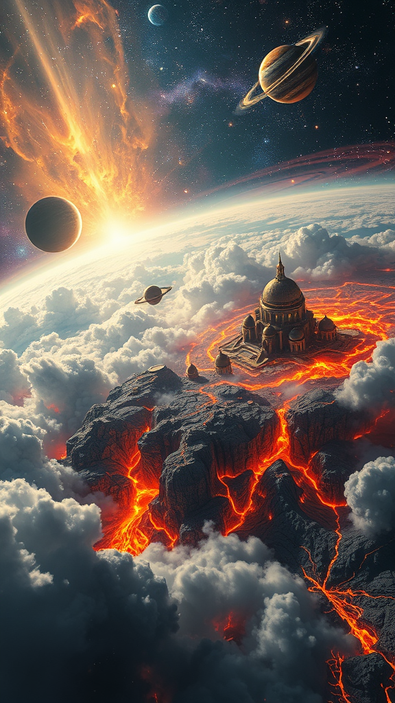 Cosmic realms within a realm, five fantastical landscapes captured from a celestial vantage point, intricately detailed, celestial paradise meets infernal abyss, vivid contrast of ethereal and fiery domains, interconnected yet distinct universes, celestial bodies orbiting a surreal juxtaposition of paradisiacal sanctuaries and fiery underworlds, a harmonious balance between light and darkness, mythical topography sprawling across the heavens and the depths.