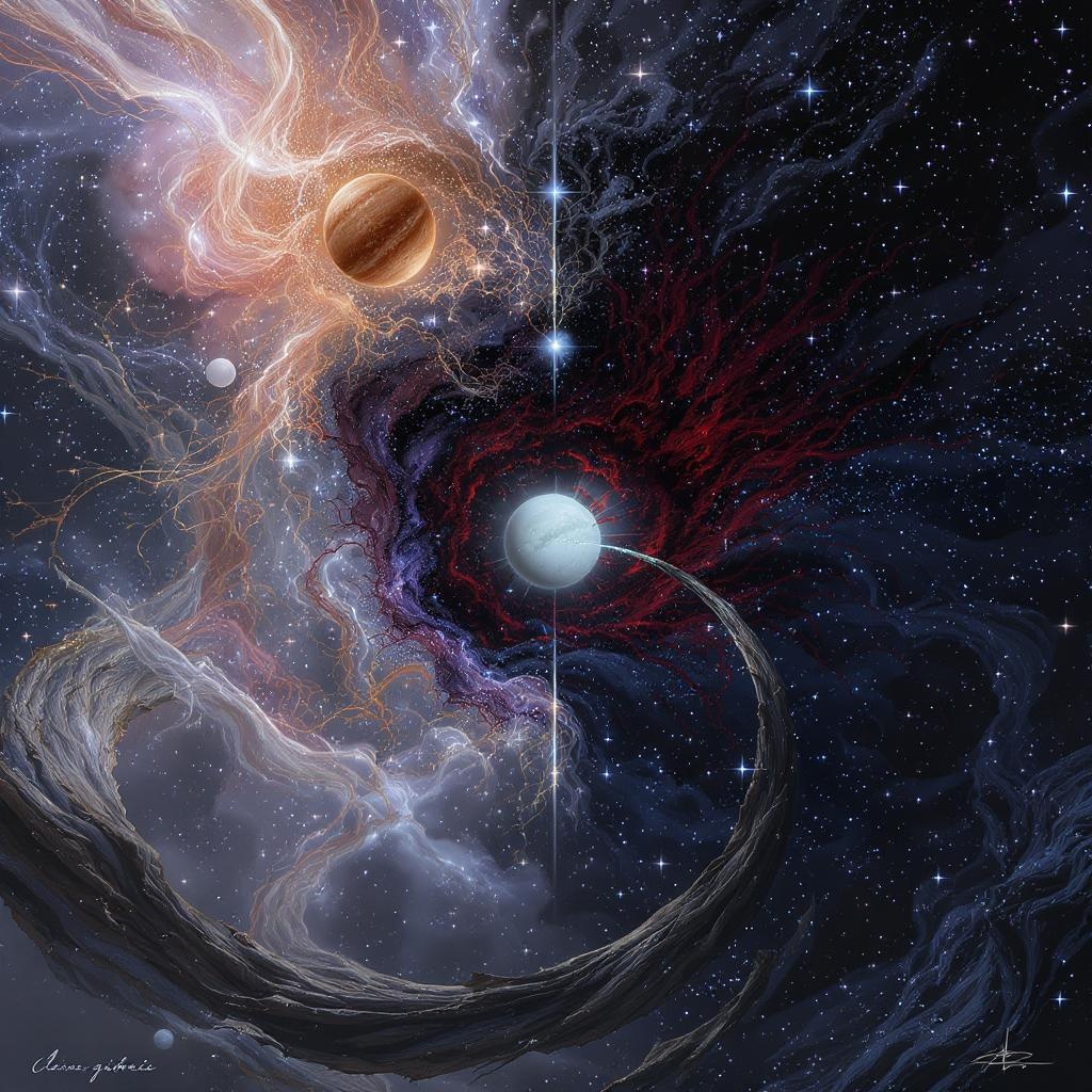 View this AI-generated image featuring cosmic realms within realms ultra detailed fantasy art celestial view otherworldly landscapes divine and infernal landscapes intertwined ethereal beauty and dark mystique celestial boundaries surreal contrast heavenly radiance and shadowy depths harmonious coex