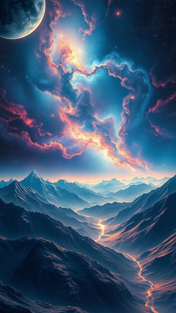 An expansive and breathtaking cosmic vista unfolds with shimmering stars and spiraling nebulae painting the night sky, as mountain peaks bask in gentle moonlight. Far-off planets drift serenely in the backdrop, while radiant streams of light weave through the scene. This masterpiece of vivid blues, fiery reds, and deep purples is intricately detailed, creating an artistic and mesmerizing space marvel, ideal for a celestial-themed wallpaper.