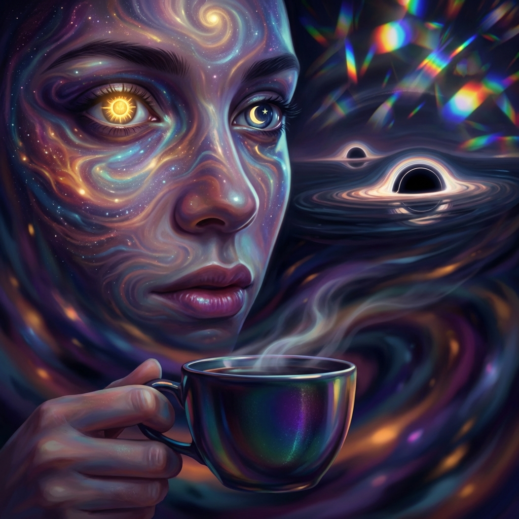 A woman's face, painted with swirling galaxies and stars, features a sun in one eye and a moon in the other. She holds a steaming cup, with black holes and cosmic phenomena in the background, creating a surreal and mystical atmosphere.