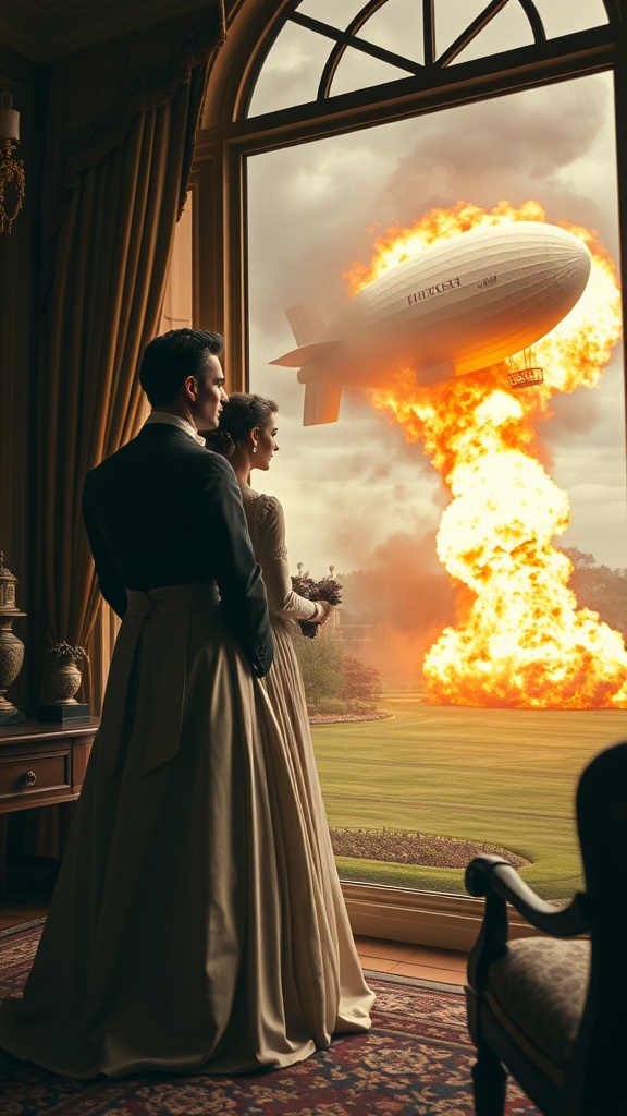 A refined couple, elegantly attired in the finest fashion of the late 1800s, stands poised by their expansive window, surveying their sprawling estate. Their expressions are calm and unwavering as they observe a dramatic spectacle: a grand dirigible, engulfed in flames, plummeting with ferocity onto their manicured lawn in a spectacular explosion. Despite the unfolding chaos, the couple's posture remains steady and dignified, reflecting their steadfast strength and resilience. This striking juxtaposition between their regal calm and the fiery calamity creates an arresting scene that captivates the imagination and imprints itself indelibly on the mind. The exquisite details of their attire and the opulent vintage decor of the room enrich the tableau, while the roaring flames and billowing smoke infuse it with a sense of impending peril. The result is a mesmerizing fusion of historical grace and dynamic action, celebrating the enduring human spirit and its resolve in times of crisis.