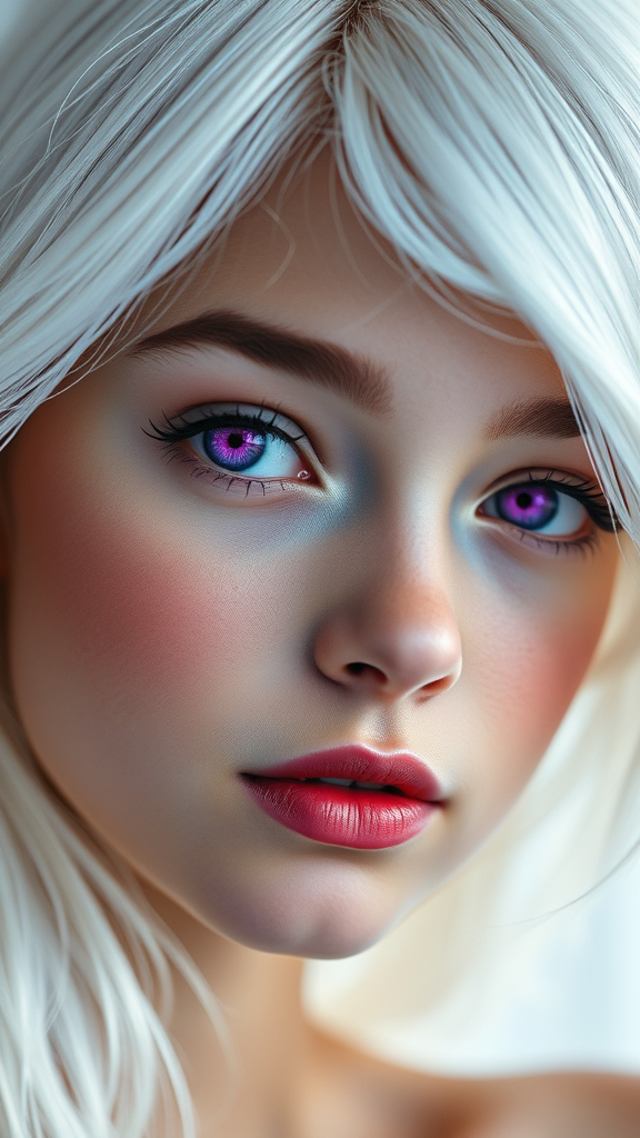 Cover magazine featuring a captivating and realistic girl with captivating purple eyes and striking white hair, detailed in vibrant colors and high-resolution 8k, UHD, HDR quality. The focus is on her alluring beauty, with an emphasis on a flawless and clear complexion. The scene is devoid of any imperfections or distortions, ensuring natural proportions and elegance. The composition avoids unnecessary text or logos, highlighting the artistry of the image.