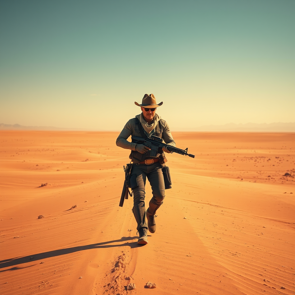 Cowboy ranger navigating a vast futuristic post-apocalyptic desert, wide open landscape with a cinematic feel, holding a high-tech rifle, vibrant HDR colors, captured in ultra-high-definition 8k, aspect ratio 3:4, evoking a sense of solitude and resilience amidst the expansive horizon.