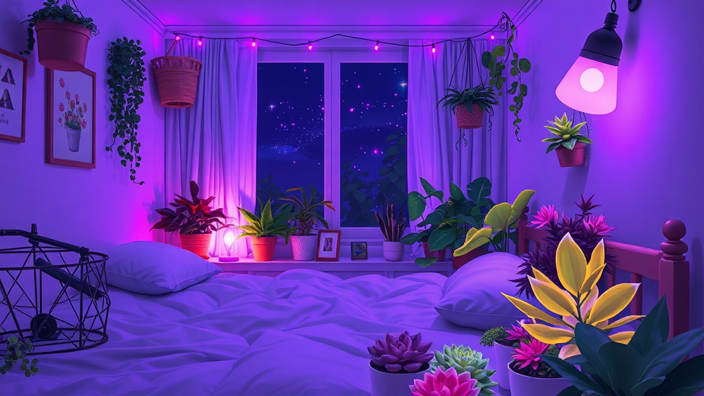 Cozy anime-inspired bedroom at night, filled with cute plants and vibrant succulents, bathed in soothing purple ambient lights, creating a charming and whimsical atmosphere.