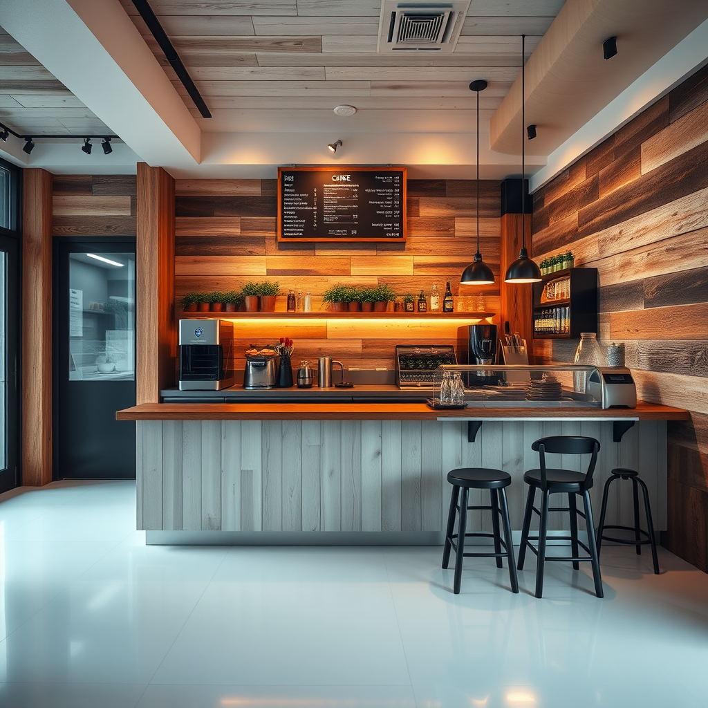 Cozy coffee nook with a sleek bar counter, rustic wooden wall panels, pristine white flooring, ambient warm lighting casting a soft glow, a minimalist design featuring clean lines, and a chalkboard menu perched above.