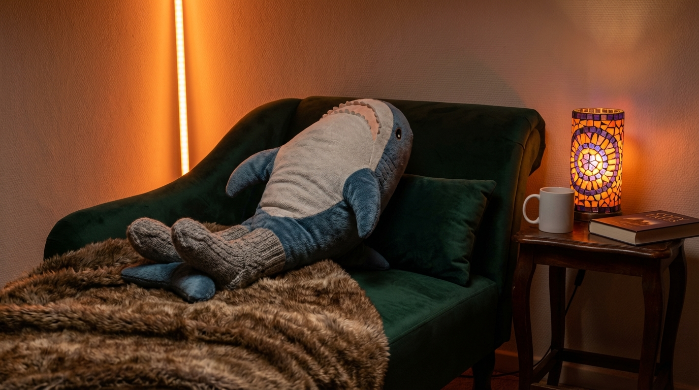 A charming shark plushie with knitted socks lies comfortably on a dark green velvet chaise lounge, draped with a faux fur blanket. Warm LED lighting and a mosaic lamp create a cozy, relaxed atmosphere in this inviting scene.