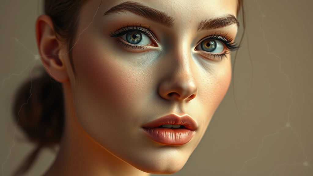 Cracked digital portrait, high-fashion allure, luxury brand essence, muted beige palette, slender form, --ar 4:5.